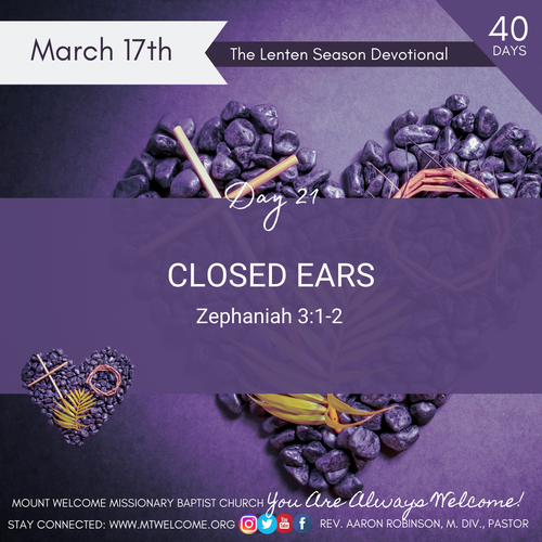The text in Zephaniah has outlined how other nations have failed and are being punished by God for not listening to what thus says the Lord. In this third chapter the prophet addresses the nation of Israel and how the people have failed to listen to what God is saying. Zephaniah is simply saying that the people have closed ears which is allowing wickedness to run rampant and push them away from God. The prophet is outlining how the people have failed to hear what God is saying and how they're failure to listen is causing them to lose favor with God.