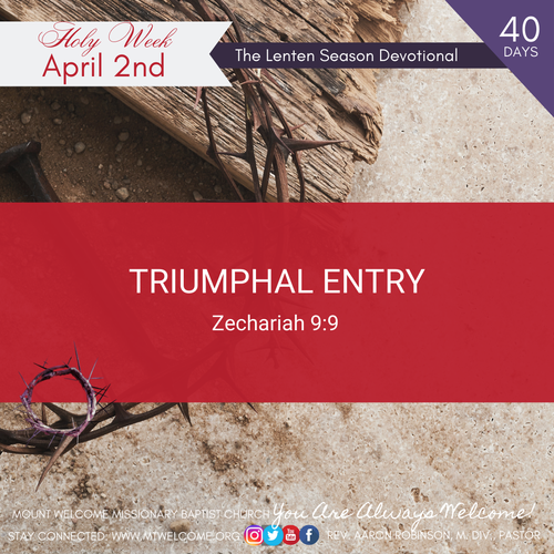The word Triumphal is used to describe things that are done or made to celebrate a victory or great success. The triumphal entry was a significant event, not only to the people of Jesus’ day, but to Christians throughout history. We celebrate Palm Sunday to remember that momentous occasion. Mt. Welcome has made it a tradition of celebrating Palm Sunday by giving out palm leaves to remember what our Lord and Savior sacrificed for us.
